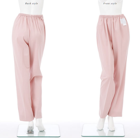 MF-8313/女子スラックス ピンク、ブルー、グリーン ¥3,800(本体価格) 【お取り扱い上の注意点】1・当商品はポリエステル主体で作られていますので、」オートクレーブの使用はお避けください。高圧高温のオートクレーブの使用により、たたみシワなど、シワがセットされ、取れなくなります。また、ポリエステルが収縮しますので、寸法変化が大きくなります。2・シーツ、病衣のような高温でのローラープレス仕上げはお避けください。表面がつぶされたまま高温度がかかるため、表面に「テカリ」が生じます。 ●ポケットなし