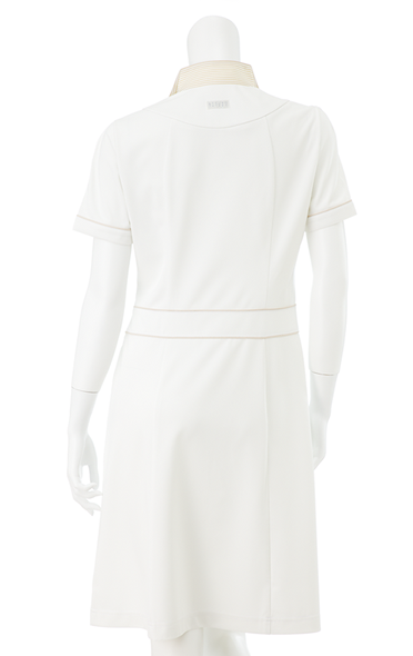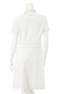 ①透け防止フルダルポリエステル糸使いにより、極めて高い透け防止効果があります。②極めて高いストレッチ性が有ります。③特殊な糸使いにより、肌に触れるとヒヤっとする接触冷感素材です。④ニット素材のため、通気性があり、防皺性にも優れています。⑤洗濯耐久性のある制菌加工を施し、清潔で快適に着用していただけます。 ⑥着用時のまとわりつきや、パチパチ放電を低減させるために制電糸を使用しています。⑤業務用洗濯にも耐えうる形態安定素材です。