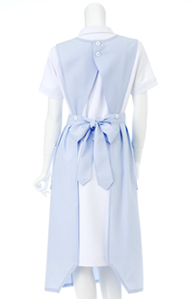KEX-1135/ケアガウン ホワイト、ピーチ、サックス ¥3,400(本体価格) 後背部分はボタンでおさえ、肩ひもが落ちない工夫がしてあります。スカート部分のたっぷりシルエットが優しい雰囲気を出しています。 ●両腰ポケット