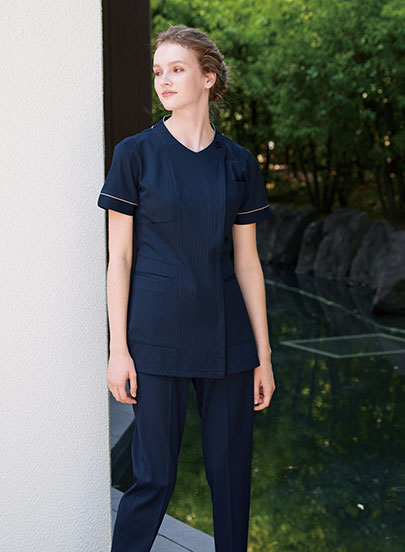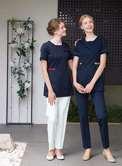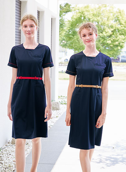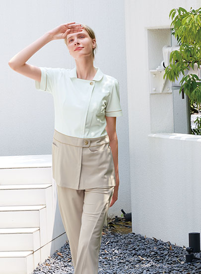プロフェッショナル仕様に加え、さらに女性らしさ、ポケットやプリーツなどにより機能性をファッショナブルにアップ。配色、ウエストベルトにも新工夫。信頼感を新鮮に訴えます。